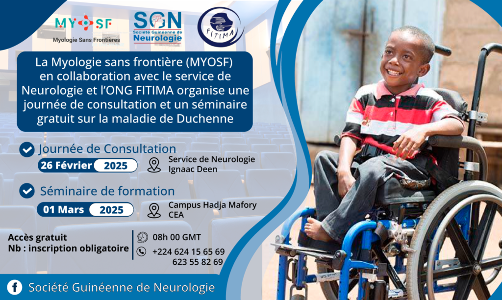 S'inscrie au séminaire Le 26 février 2025, le service de neurologie de l’hôpital national Ignace Deen sera le théâtre d’un événement médical exceptionnel : une journée de consultation gratuite organisée par l’association Myologie Sans Frontières (MYO-SF) en collaboration avec le service de neurologie de l’hôpital. Cet événement marquera également le début d’un séminaire de formation […]